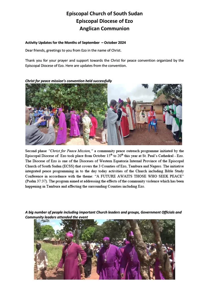 In October 2024, the Episcopal Diocese of Ezo hosted the second phase of the Christ for Peace Mission at St. Paul’s Cathedral, bringing together over 3,500 people to promote peace and reconciliation under the theme: “A Future Awaits Those Who Seek Peace” (Psalm 37:37).