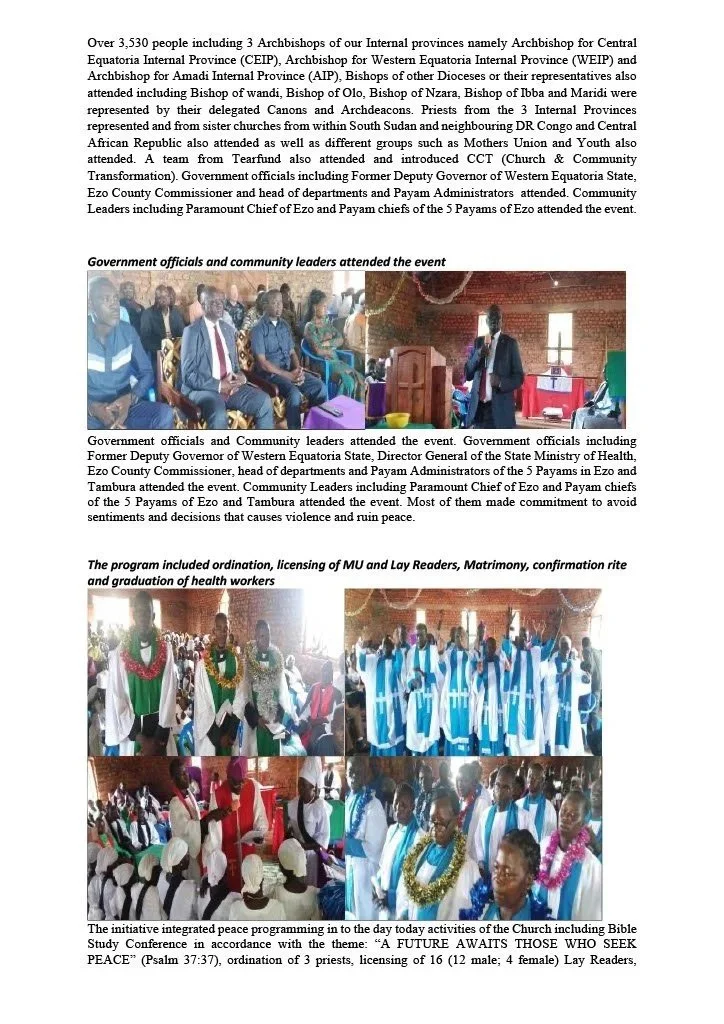 The event included Bible study, ordinations, licensing of lay readers, confirmation of 35 candidates, blessing of 10 marriages, and the graduation of 23 health workers. Mothers’ Union members and youth groups shared music and messages of peace, while government and community leaders pledged to end violence.